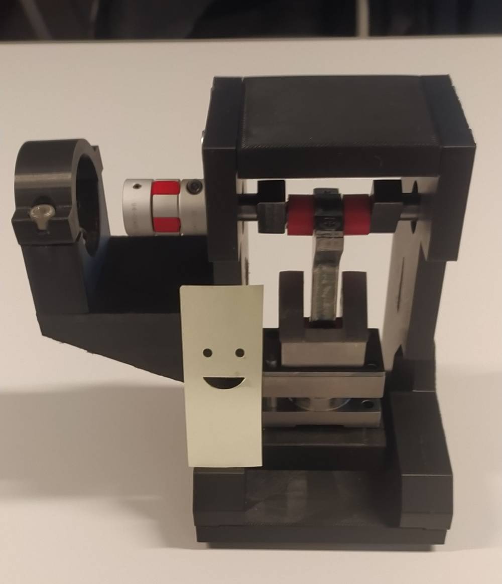 - Torben Kühling und Philipp Thyen entschieden sich für die Entwicklung einer Exzenterpresse, die Smileys in Papier stanzen kann. Die Ansteuerung mit der Betriebsartenauswahl Einrichtbetrieb, Einzelbetrieb und Dauerbetrieb wurde mit einer Kleinsteuerung LOGO! umgesetzt. Neben der sehr guten Dokumentation fertigten die beiden die Exzenterpresse in ihrer unterrichtsfreien Zeit. Zum Einsatz kamen dabei verschiedene Fertigungsverfahren wie z.B. Drehen, CNC-Fräsen, Drahterodieren und 3D Druck.