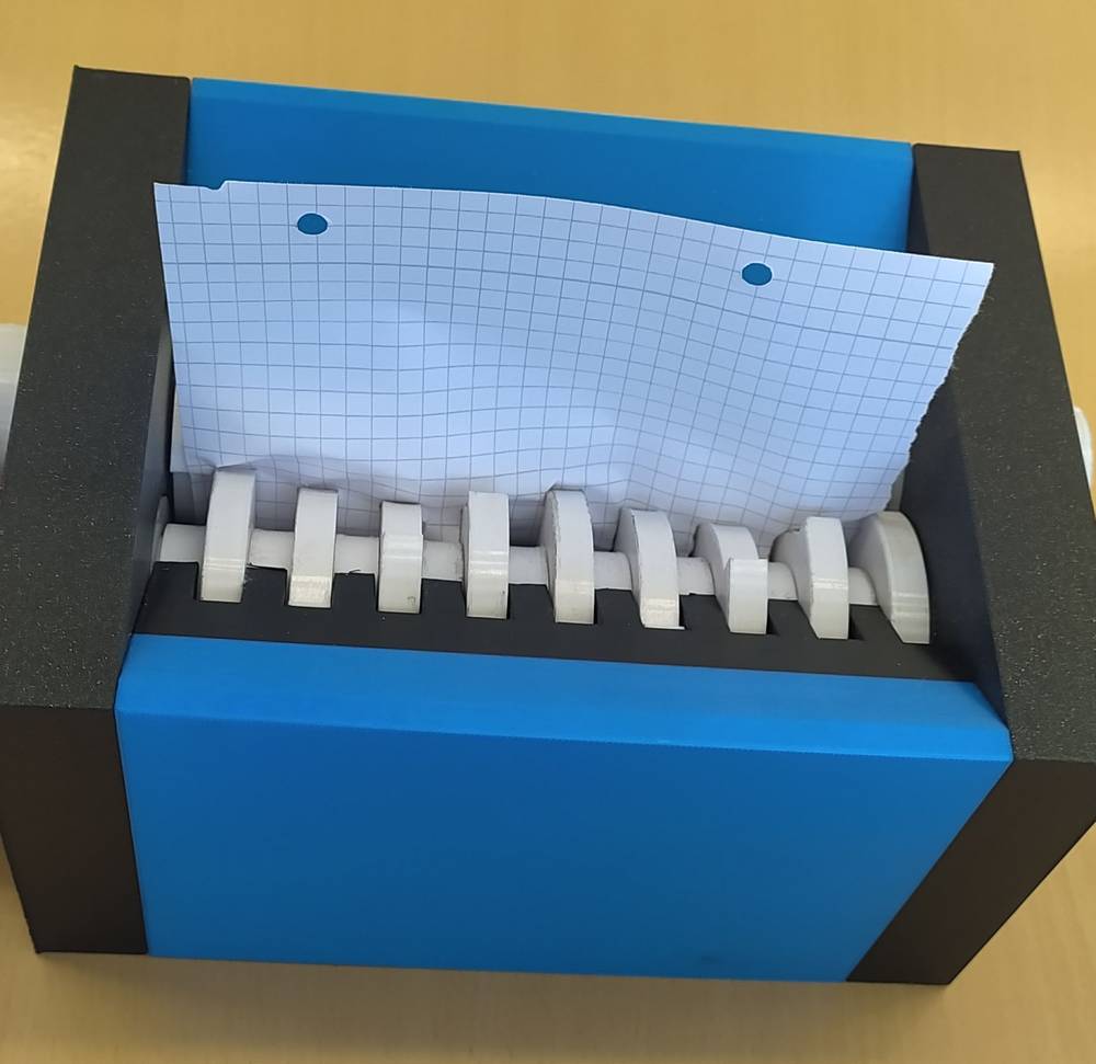 - Malte Germann, Lukas Roberg und Simon Ellmann konstruierten einen funktionsfähigen Schredder, der Papier in Größe von DIN A5 zerkleinern kann. Da sie als Antrieb einen gängigen und erschwinglichen Elektromotor nutzen wollten, konstruierten sie das erforderliche Getriebe zur Wandlung der Drehzahl und des Drehmoments ebenfalls mit. Auch diese Gruppe konnte das fertige Modell vorführen, was die Zuschauer sichtlich interessierte. Die Teile wurden mittels 3D Druck erstellt.